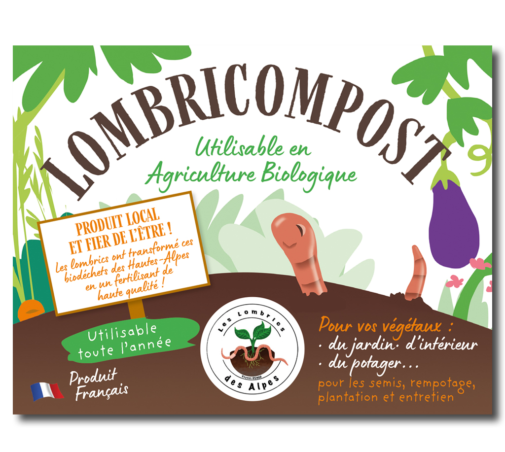 Une étiquette amusante pour un projet original de lombricompostage : illustré main et mise en page par PICTOLIGNE.